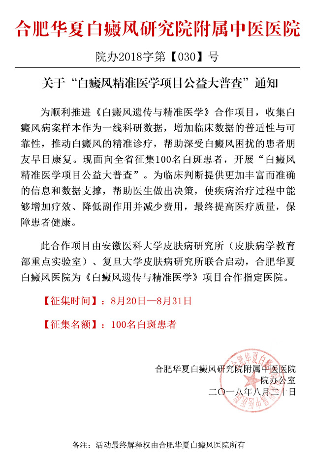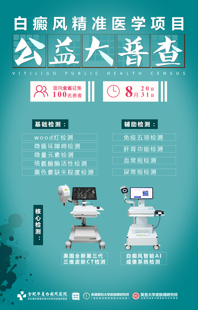 合肥华夏白癜风医院作为《白癜风遗传与精准医学》科研项目的参与单位(安徽省独家指定单位),致力于白癜风临床科研与诊疗服务。为顺利推进《白癜风遗传与精准医学》合作项目,增加临床数据的普适性与可靠性,合肥华夏积极开展“白癜风精准医学项目公益大普查”活动,面向全省征集100名白斑患者,旨在收集白癜风治疗样本与案例作为一线科研数据,以便后期用大数据给医生凝练有效的判断依据,帮助医生做出决策,使决策增加疗效、降低副作用和减少费用,最终提高疗效、保障人民的健康,提高医疗质量,降低费用,解决看病贵的问题。