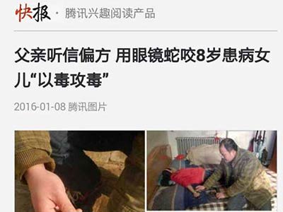 近日,一父亲听信偏方,竟然用眼镜蛇咬自己8岁的患病女儿,希望能“以毒攻毒”,险些酿成惨剧。可怜天下父母心,这位父亲的所作所为虽是出自好心,但显然是急昏了头病急乱投医。任何疾病的治疗都应该遵照事实的客观规律,尊重科学,而不是盲从三人成虎的民间偏方。